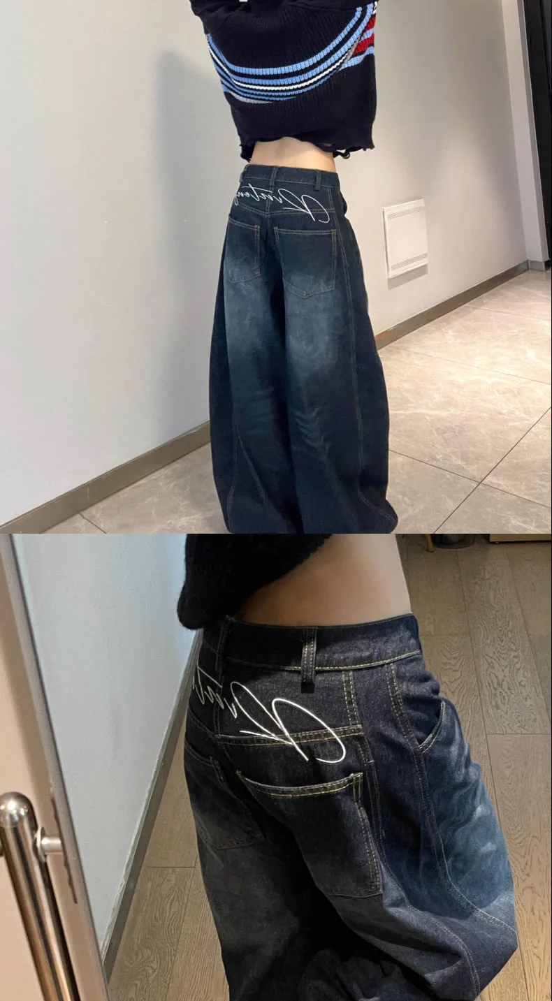 New Womens Jeans High Waist Vintage Design Hip Hop Straight Baggy Denim Pants Street Y2K American Style Wide Leg Denim Trouser